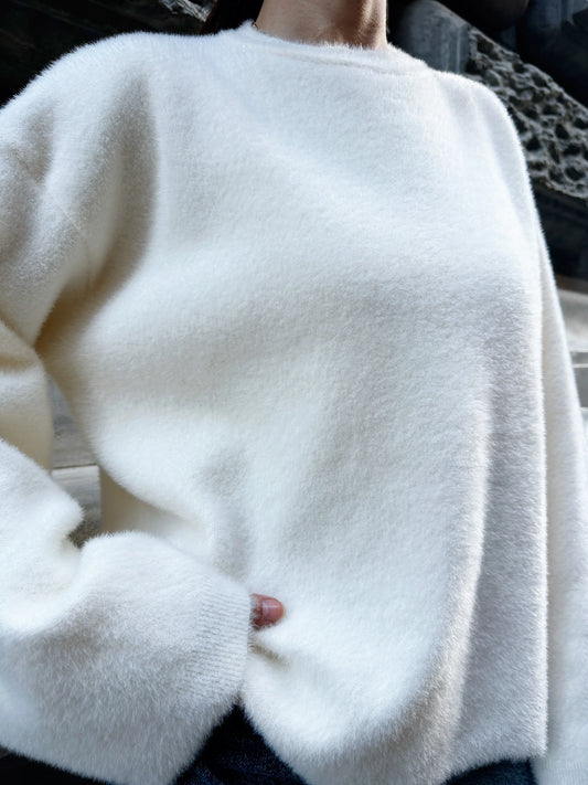 Oversize Bisiklet Yaka Yumuşak Dokulu Şardonlu Triko Kazak - Beyaz