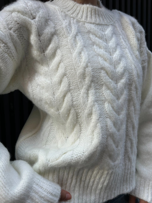 Saç Örgü Desenli Şardonlu Triko Kazak - Beyaz