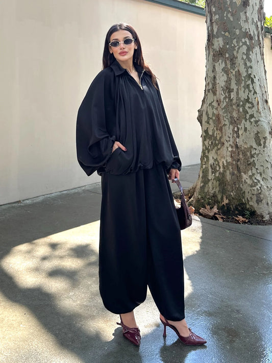 Saten Büzgülü Pileli Bumber Ceket Pantolon Takım - Siyah