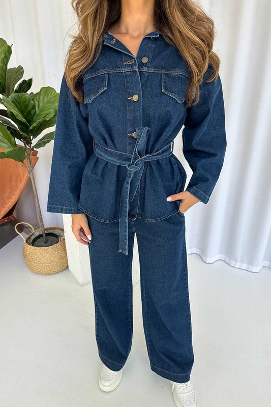 Ceket Yaka Beli Kuşaklı Kot Gömlek & Pantolon Takım - Lacivert