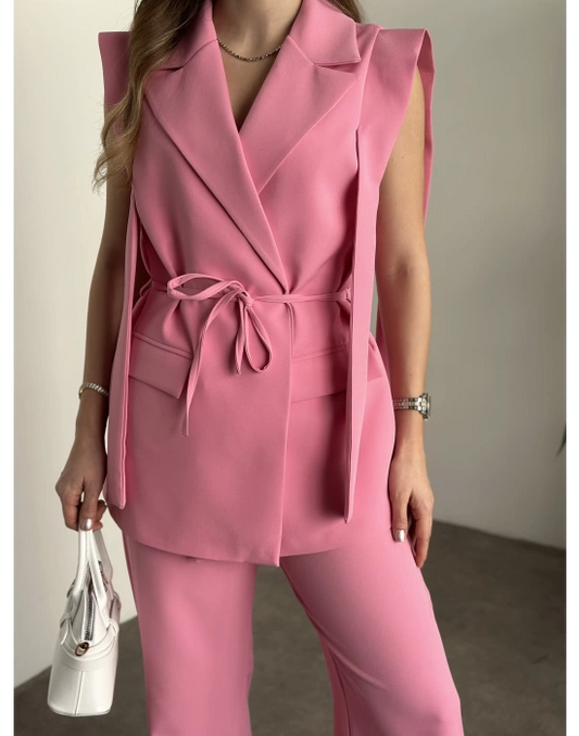 70% İNDİRİMSıfır Kol Belden Bağlamalı Kumaş Takım - Pembe