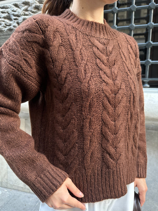 Saç Örgü Desenli Şardonlu Triko Kazak - Kahverengi