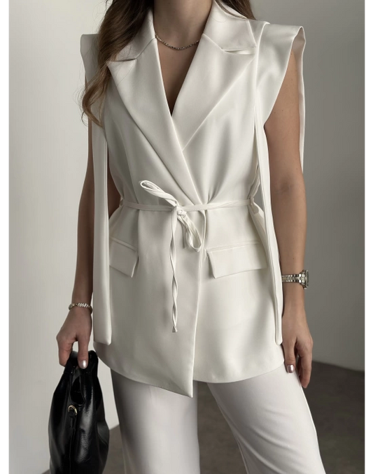 Sıfır Kol Belden Bağlamalı Takım - Beyaz