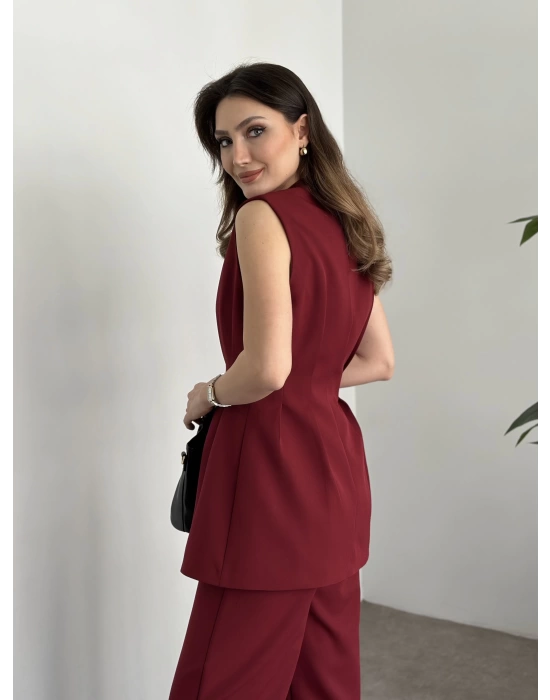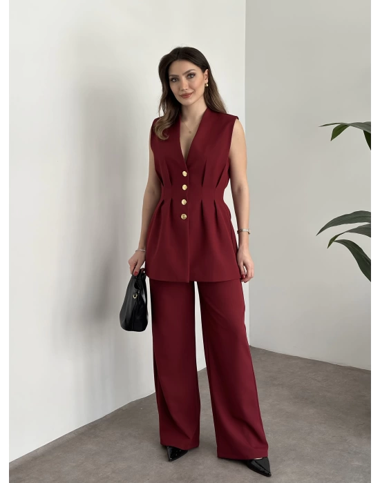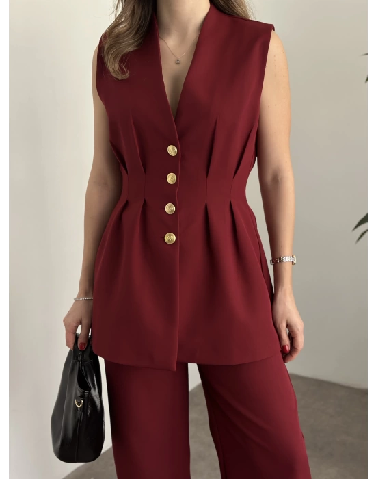 Gold Düğmeli Belden Oturtmalı Takım - Bordo