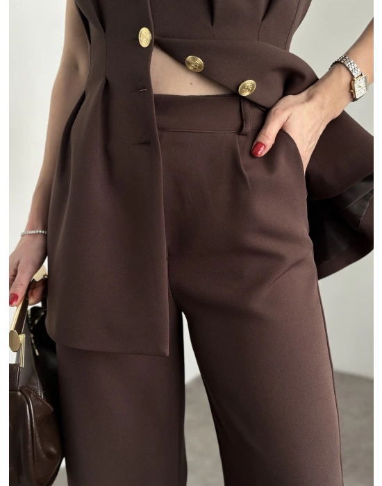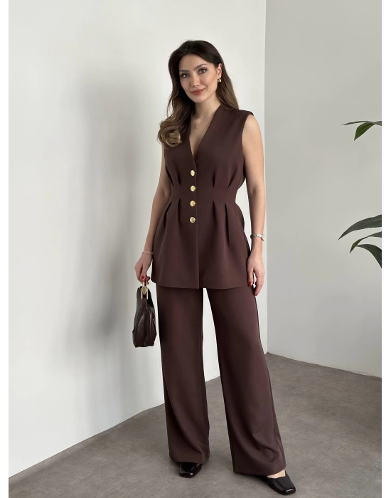 Gold Düğmeli Belden Oturtmalı Takım - Kahve