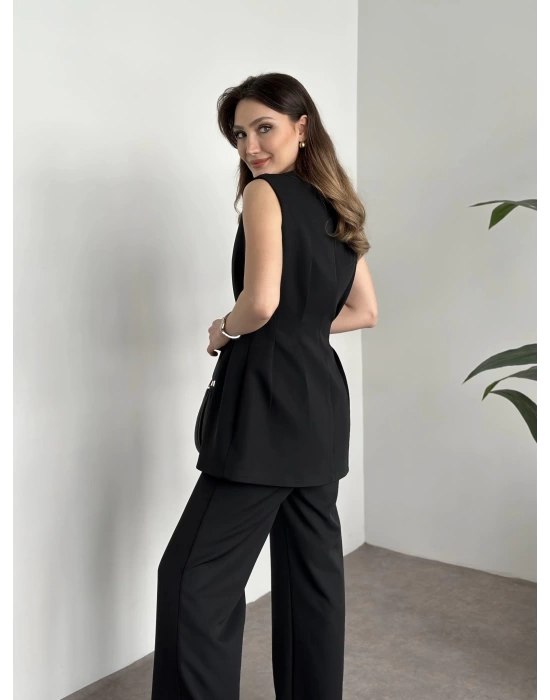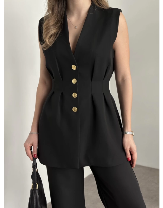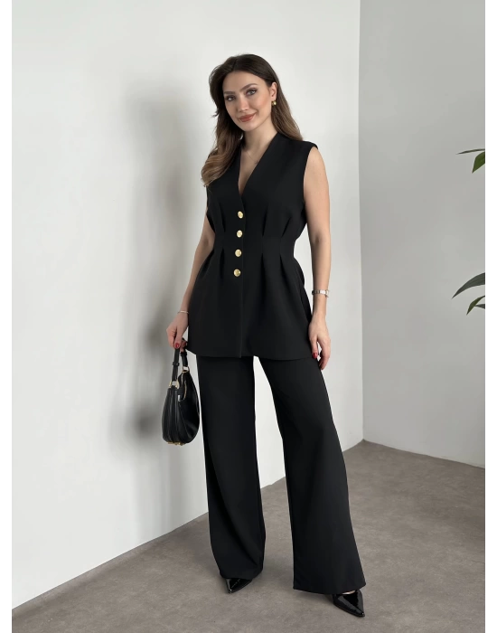 Gold Düğmeli Belden Oturtmalı Takım - Siyah