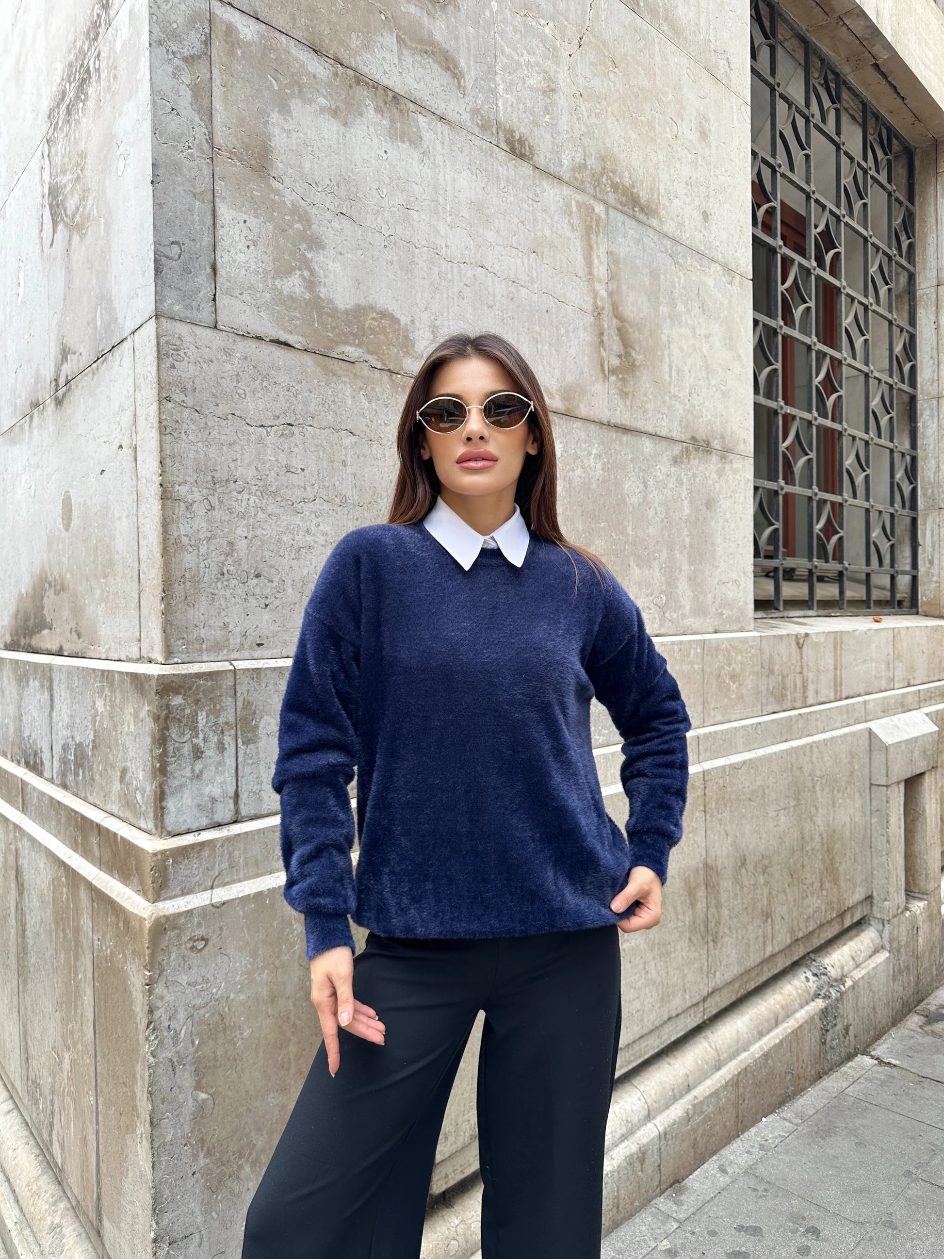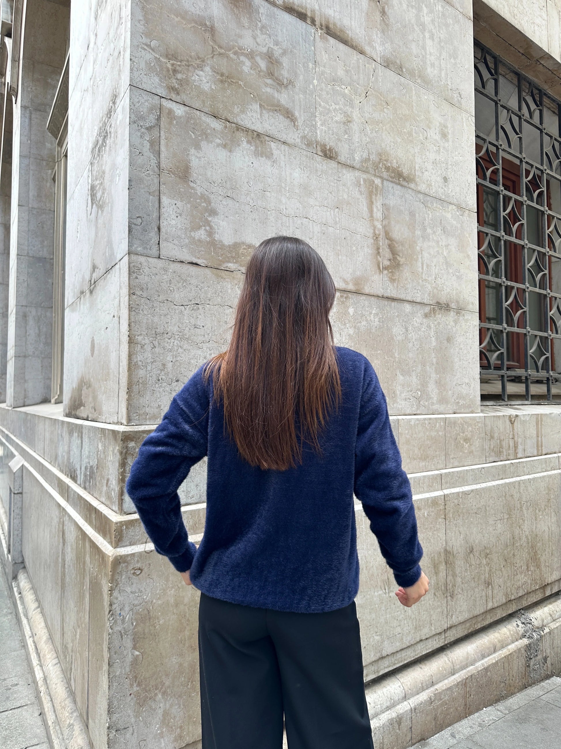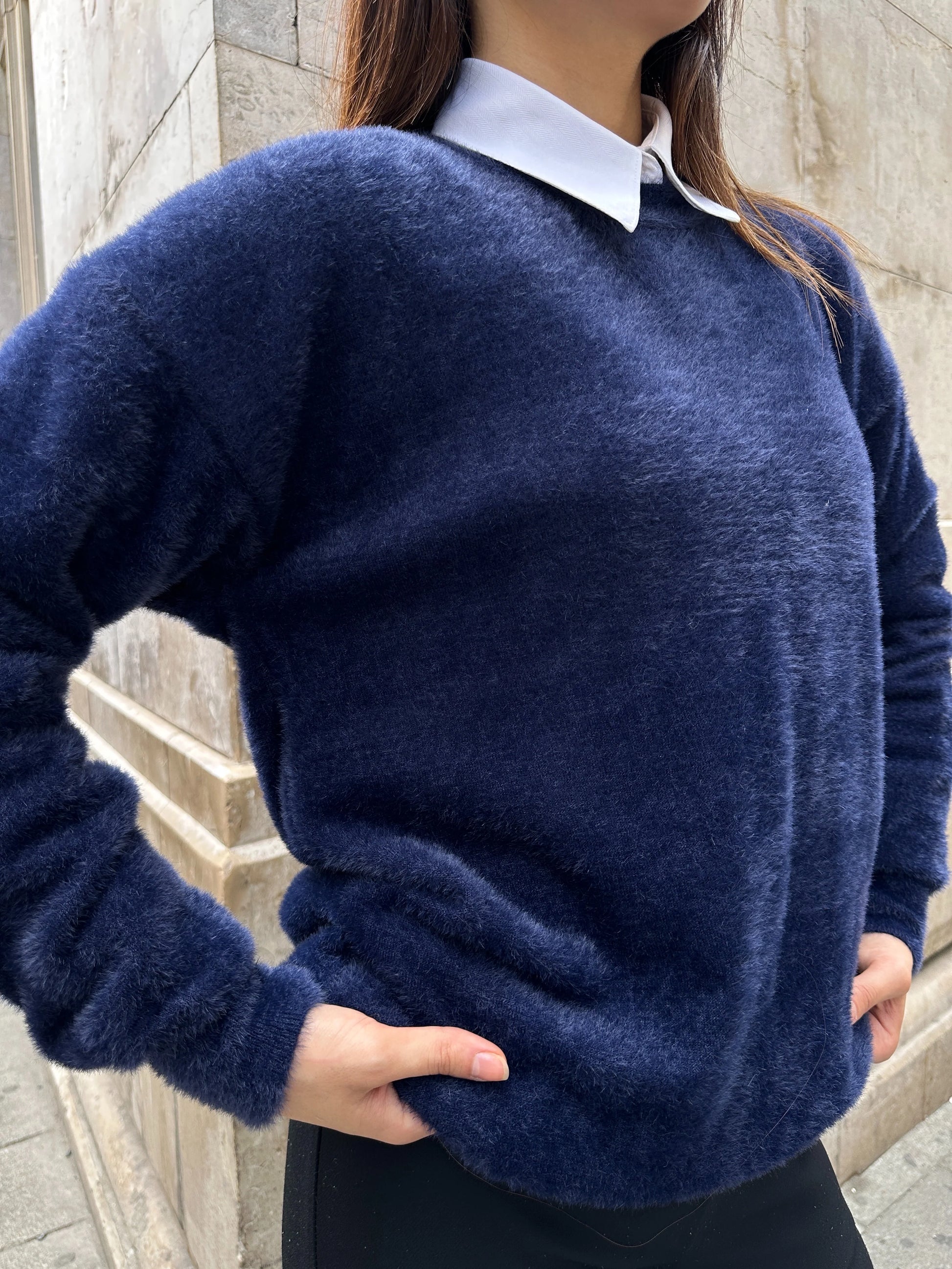 Oversize Bisiklet Yaka Yumuşak Dokulu Şardonlu Triko Kazak - Lacivert