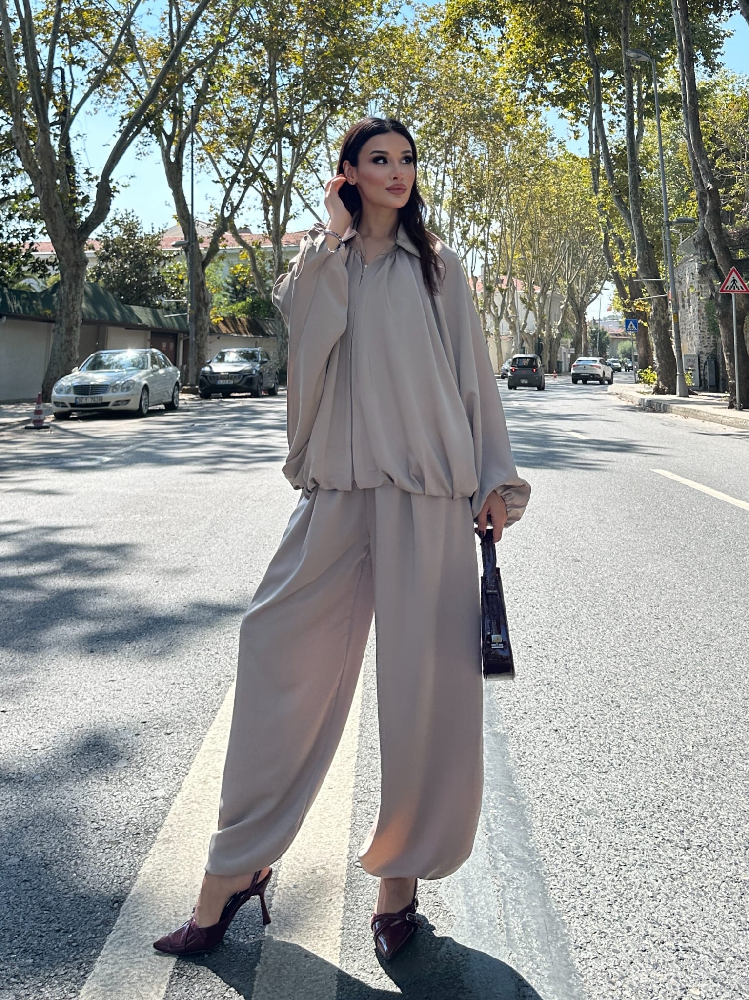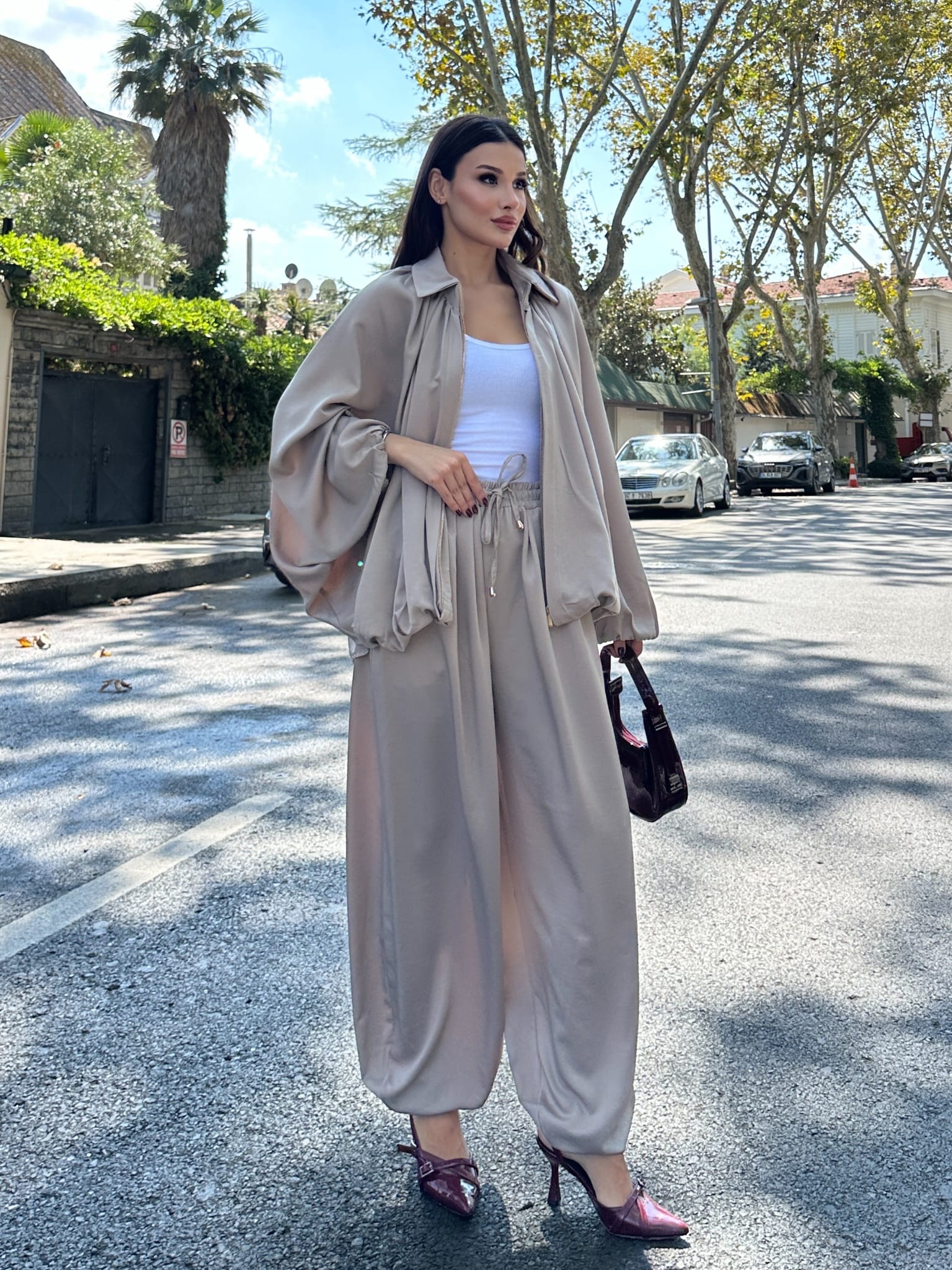 Saten Büzgülü Pileli Bumber Ceket Pantolon Takım - Bej