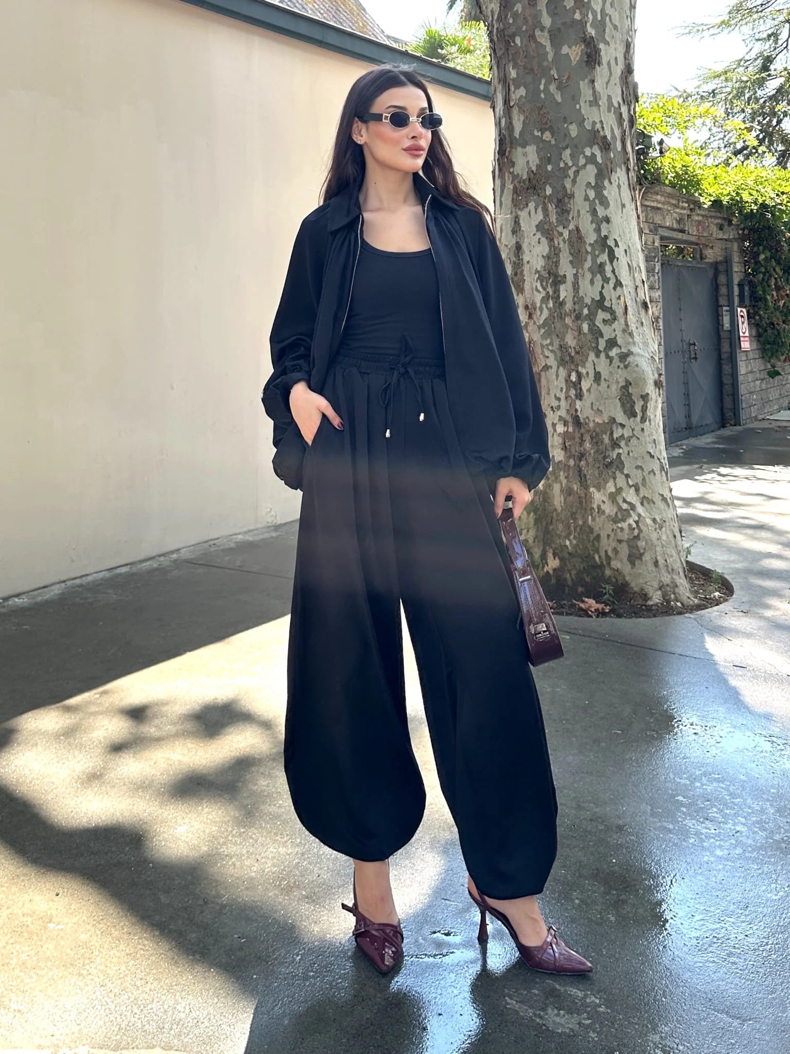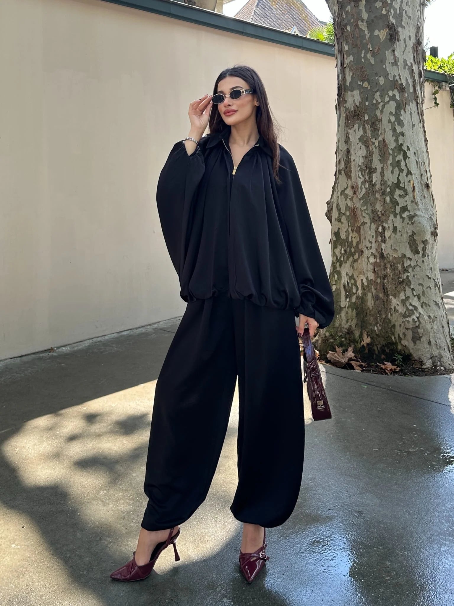 Saten Büzgülü Pileli Bumber Ceket Pantolon Takım - Siyah