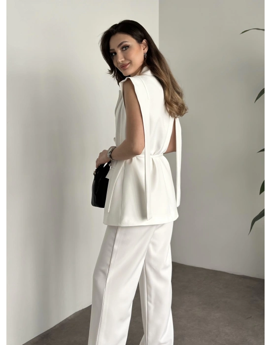 Sıfır Kol Belden Bağlamalı Takım - Beyaz